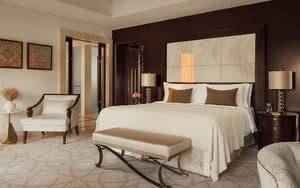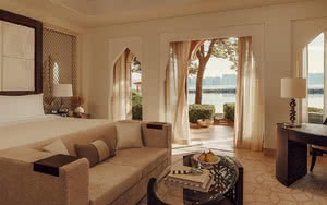 La suite en bord de mer dispose d'une piscine privée face à la mer et d'une spacieuse terrasse ensoleillée. A l'intérieur, un vaste espace de vie, avec des salons, un espace de travail et une salle à manger. La grande chambre principale est dotée d'un lit king-size, au milieu d'une pléthore d'oreillers en velours.