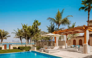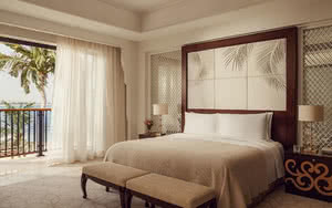 Entouré de pelouses verdoyantes et de palmiers, cet espace ouvert comprend un canapé et un coin salon confortable, ainsi qu'une grande salle de bain, une baignoire en marbre blanc et une douche à effet pluie. Elle est dotée d'un lit king-size et offre une vue imprenable sur le golfe Persique.